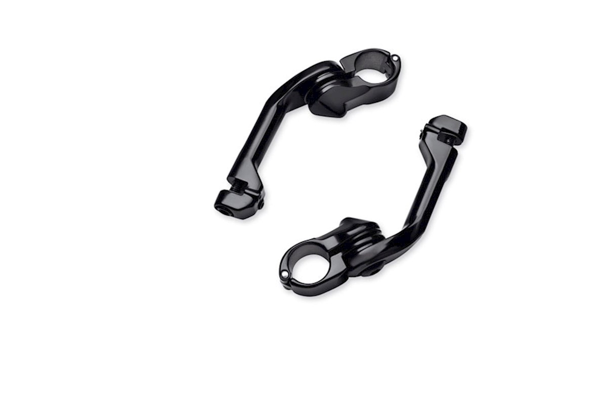 Stretch out for added comfort. This Adjustable Highway Peg Mounting Kit can be set for shorter riders and it can be reversed to reach far forward for those with long legs. The angled design allows the arm to reach back and around to clear fairing lowers. The arm can be raised and lowered for a custom fit. The mounting clamp firmly grips the engine guard and the locking design secures the peg at the desired angle. Available in mirror-chrome or gloss black finishes, the complete kit includes matching mounting hardware. Footpegs sold separately. Fits 1.25" engine guards.