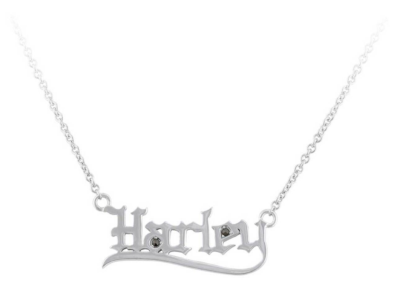 Harley-Davidson® Women's Old English Harley® Necklace. A great new design addition to the Harley-Davidson® line. Constructed from high-quality shiny Sterling Silver. Features a stunning Old English engraved Harley® design with black rhinestones. Adjustable 16" chain. Secure lobster clasp closure. Mod Jewelry is hand crafted with the highest attention to detail and quality, utilizing the finest materials. This bold pendent is the perfect accessory for any occasion.