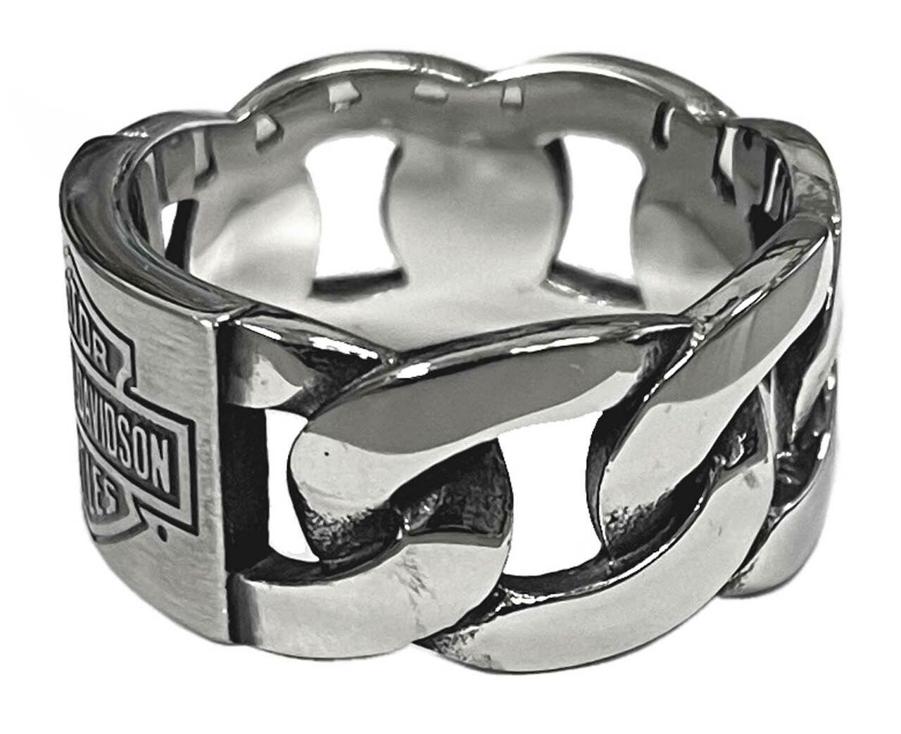 Harley-Davidson® B&S schakelring. Uitgevoerd met iconisch Bar & Shield logo afgemaakt met het design van een ketting. gemaakt van hoogwaardig zilverkleurig roestvrij staal. Hand gemaakt met alle oog voor detail en kwaliteit
