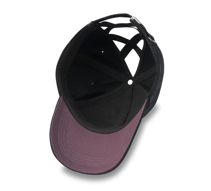 Til je look naar een hoger niveau in onze Harley-Davidson® Ponytail Cap. Gemaakt van robuuste, maar ademende katoenen keperstof met een verstelbare riem aan de achterkant voor je ideale pasvorm. Deze damescap heeft een kriskras paneel voor een paardenstaart, knot of topknoop. Hij heeft een contrasterende binnenrand en is fijn afgewerkt met een custom allover patroon van onze open Bar & Shield.