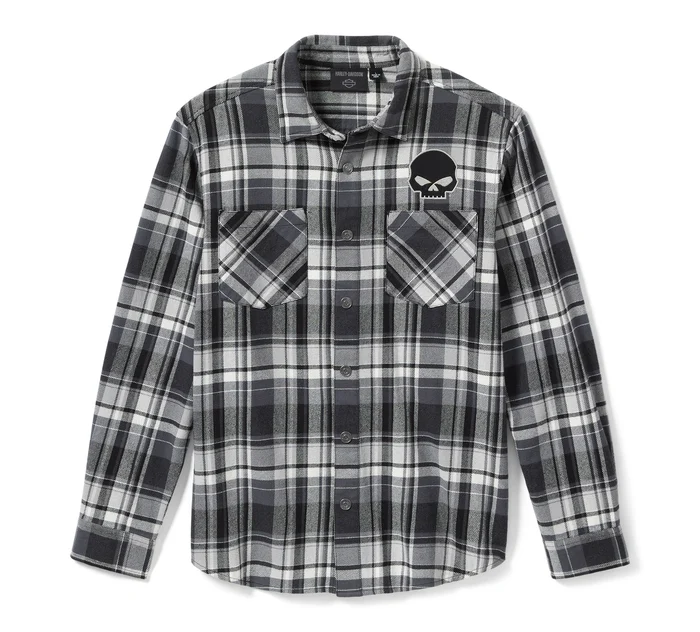 Met ons Willie G™ Skull Plaid Long Sleeve Shirt combineer je een klassiek patroon met de creatieve nalatenschap van Willie G. Davidson. Dit shirt met drukknoopsluiting voor mannen is robuust en ademt. Het is gemaakt van zware katoenen keperstof en heeft een verborgen drukknoopkraag die onder de motorkleding blijft zitten. Het is afgewerkt met een geborduurde applicatie van onze stoere Willie G™ Skull-graphics. De Skull wordt gezien als een van zijn meest populaire creaties. Daarnaast ontwierp Willie G. Davidson ook verschillende motoren, waaronder de FX Super Glide® uit 1971 en de FXS Low Rider® uit 1977.