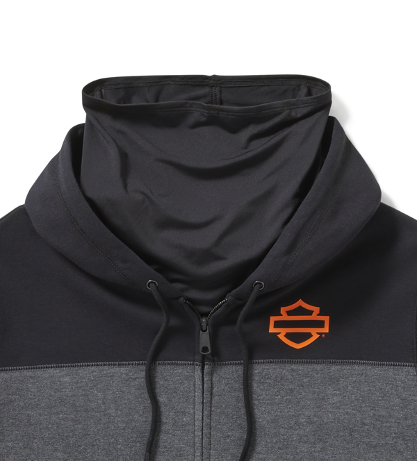 Levendige motorstijl vindt pure functionaliteit in onze H-D® TECH Gaiter Full Zip. Gemaakt van duurzaam en toch comfortabel van een zware katoen/polyester interlock in een relaxte pasvorm. Met een ingebouwde nekbeschermer om over je mond en neus te dragen om wind, stof en insecten buiten te houden, waardoor het een praktische keuze is onder je motorkleding. Deze hoodie voor mannen met rits aan de voorkant is afgewerkt met onze eigentijdse graphics en een colorblock-ontwerp dat overal opvalt.