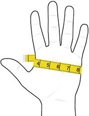 Om je maat op te nemen gebruik je een meetlint die je volgens de afbeelding hiernaast om je hand heen slaat. Let er op dat leren motorhandschoenen nog een stuk gaan uitrekken en dat je ze dus aan de strakke kant moet kopen. Textiele motorhandschoenen mogen juist weer iets losser zitten, zodat je handen met kouder weer niet te snel afkoelen.