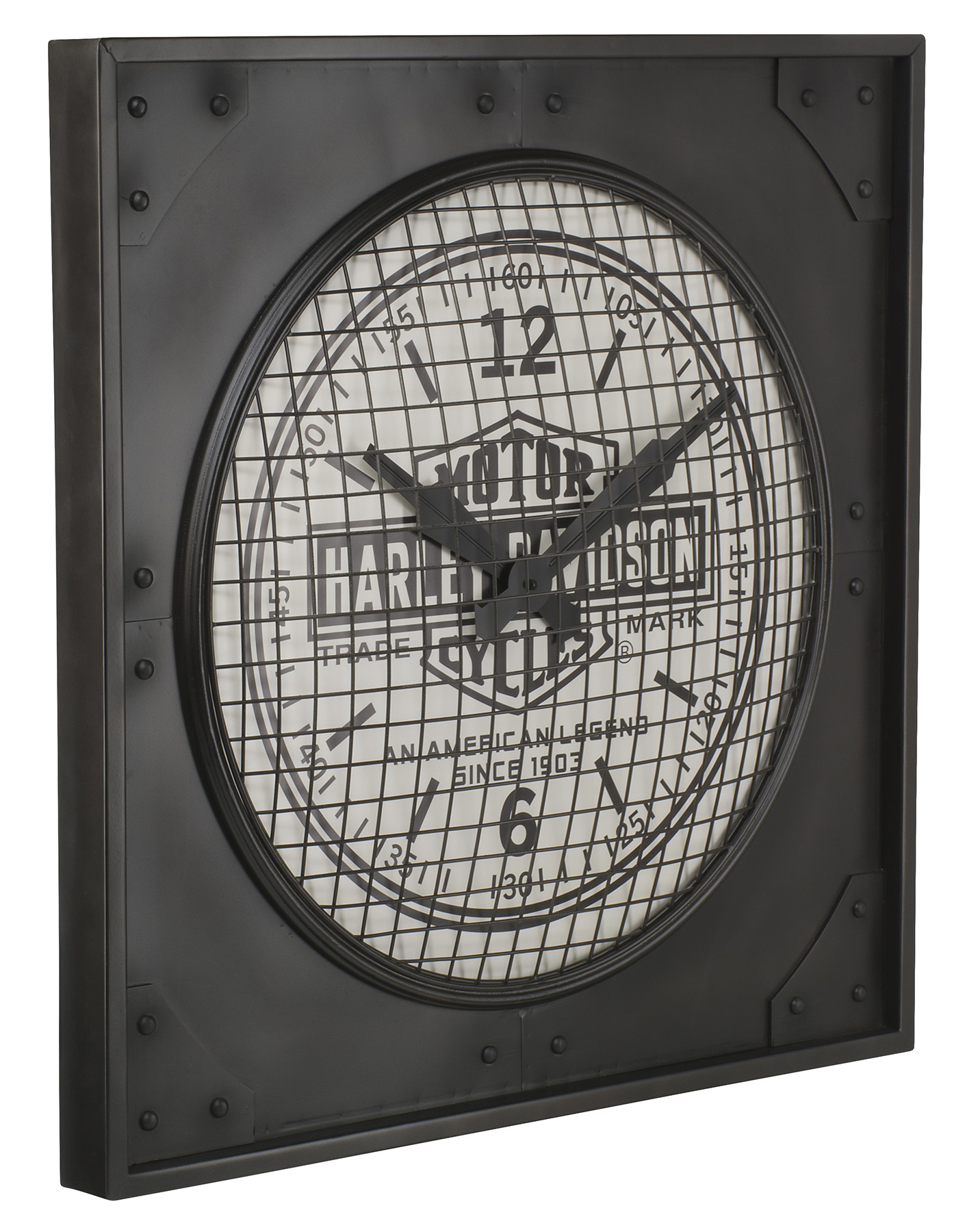 H-D industriële metalen klok Grote, vierkante metalen klok met industriële uitstraling en verouderde afwerking. Met Nostalgic Bar & Shield-logo en "AN AMERICAN LEGEND SINCE 1903"- afbeelding op de wijzerplaat beschermd door een robuuste metalen kooi. Afmetingen: 24" B x 24" H / 61 x 61 cm Wijzerplaat: 19" diameter / 48 cm
