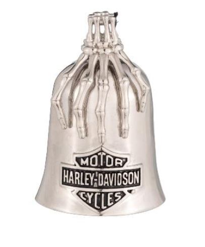 Harley-Davidson® "B&S Skull Hand" Geluksbrenger voor aan de motor. De bel is gemaakt van metaal en is voorzien van een touwtje om de bel mee op te hangen (voor een veilige bevestiging adviseren wij de bel vast te maken met een tie wrap) Inclusief vilten cadeauverpakking en een kaartje met de legende van de Ride bells.