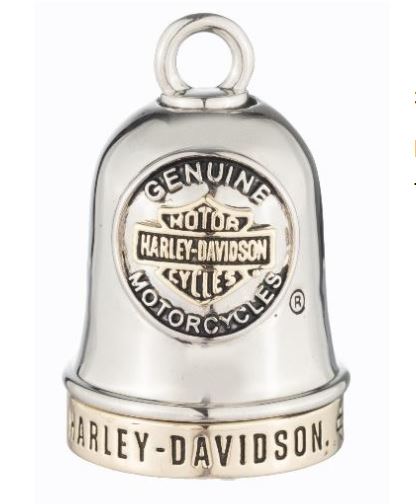 Harley-Davidson® "Crest" Geluksbrenger voor aan de motor. De bel is gemaakt van metaal en is voorzien van een touwtje om de bel mee op te hangen (voor een veilige bevestiging adviseren wij de bel vast te maken met een tie wrap) Inclusief vilten cadeauverpakking en een kaartje met de legende van de Ride bells.