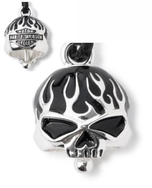 Harley-Davidson® "Flaming Willie G Skull" Geluksbrenger voor aan de motor. De bel is gemaakt van metaal en is voorzien van een touwtje om de bel mee op te hangen (voor een veilige bevestiging adviseren wij de bel vast te maken met een tie wrap) Inclusief vilten cadeauverpakking en een kaartje met de legende van de Ride bells.