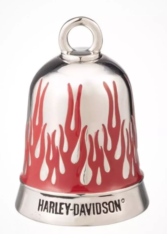 Harley-Davidson® "Red Flame" Geluksbrenger voor aan de motor. De bel is gemaakt van metaal en is voorzien van een touwtje om de bel mee op te hangen (voor een veilige bevestiging adviseren wij de bel vast te maken met een tie wrap) Inclusief vilten cadeauverpakking en een kaartje met de legende van de Ride bells.