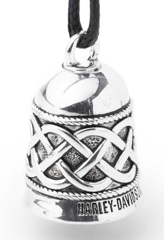 Harley-Davidson® "Weave Pattern" Geluksbrenger voor aan de motor. De bel is gemaakt van metaal en is voorzien van een touwtje om de bel mee op te hangen (voor een veilige bevestiging adviseren wij de bel vast te maken met een tie wrap) Inclusief vilten cadeauverpakking en een kaartje met de legende van de Ride bells.