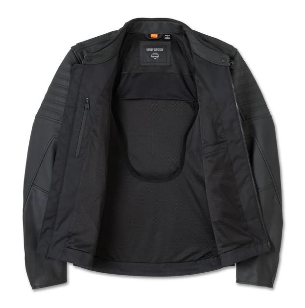 • Intrekbare kraag met drukknoopsluiting. Leren stukken. Gewatteerde quilt op de bovenarmen. Reflecterende biezen.