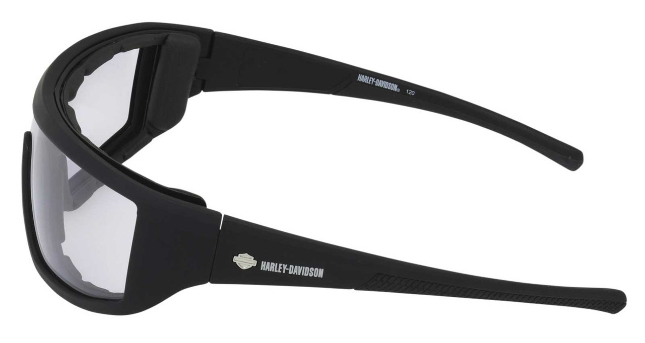 Matzwart frameHeldere lichtregelende lensVerwijderbare schuimrubberen pakkingAnti-condens lens technologieMetalen Bar & Shield-logoHarley-Davidson® logo op beide buitenste veren.